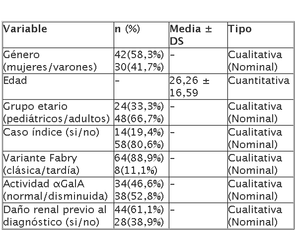 Estudio epidemiológico, de corte transversal, realizado en tres centros de Argentina, incluyendo datos de la primera consulta de pacientes con diagnóstico de EF, desde enero de 2007 hasta julio de 2021. El estudio fue aprobado por cada comité de ética local y los pacientes firmaron un consentimiento informado por escrito previo al ingreso al estudio. El presente estudio se realizó en cumplimiento de la Declaración de Helsinki. Todos los pacientes incluidos presentaron diagnóstico confirmado de EF por manifestaciones clínicas típicas o antecedentes familiares de la enfermedad además de dosaje de actividad de αGalA más estudio mutacional por Multiplex Ligations Probe Amplification (MLPA) y secuenciación directa (Medical Genetics Laboratories-Baylor College of Medicine, Houston, TX, EE. UU.). En todos los pacientes en los cuáles se confirmó el diagnóstico de la EF se evaluó la presencia de daño renal previo, retrospectivamente, en la historia clínica de la primera consulta a cada centro. El género de los pacientes fue considerado como variable cualitativa (varón/mujer). La edad (en años) como variable cuantitativa. El grupo etario (pediátrico/adulto) como variable cualitativa por debajo o por encima debajo de 18 años. Se consideró caso índice como variable cualitativa (SI/NO). La variante (clásico/tardío) de la EF fue determinada según la clasificación de la base de datos <http://www.dbfgp.org/dbFgp/fabry/Mutation.html> como variable cualitativa. El dosaje de actividad αGal-A se consideró normal o disminuido por encima y por debajo de 4,0 nmol/h/l, respectivamente, como variable cualitativa. Para evaluar daño renal se utilizó la definición de la Kidney Disease: Improving Global Outcomes Chronic Kidney Disease Guideline (KDIGO); se consideró daño renal la presencia de albuminuria patológica (> a 30 mg/g de creatinina) y/o FGe < a 90 ml/min/m2.(28) Córnea verticilata fue evaluada mediante examen oftalmológico con lámpara de hendidura y fue considerada variable cualitativa (SI/NO).(1, 17) Dolor neuropático y manifestaciones gastrointestinales típicas de EF fueron evaluados por interrogatorio y su presencia o ausencia se consideró como variable cualitativa (SI/NO).(1, 17) La presencia o ausencia de compromiso del sistema nervioso central (SNC) fue considerada una variable cualitativa (SI/NO) y se definió por el antecedente de stroke y/o imágenes típicas en resonancia nuclear magnética (RMN) cerebral, aunque fueran asintomáticas.(1, 17) Se consideró arritmia cardíaca a la presencia de alteraciones electrofisiológicas típicas de la EF en electrocardiograma de 12 derivaciones como variable cualitativa (SI/NO), al igual que la presencia o ausencia de hipertrofia del ventrículo izquierdo (HVI) en ecocardiograma Doppler color y/o imágenes típicas RMN cardíaca.(1, 17) Hipertensión arterial (HTA) se consideró como variable cualitativa (SI/NO). Estadística descriptiva: Las variables cualitativas se expresaron como porcentajes y las variables continuas (cuantitativas) como media ± desviación estándar. Estadística inferencial: se utilizaron pruebas paramétricas o no paramétricas según el tipo de variable. Se trabajó con intervalo de confianza del 95%. Valores de p < 0,05 fueron considerados de significancia estadística. Los datos fueron procesados en una base IBM SPSS Statistics 2.0.