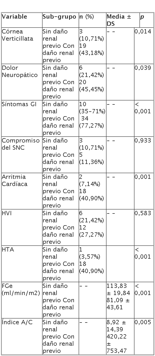 Córnea verticillata fue hallada en 16 pacientes (22,2%), manifestaciones gastrointestinales en 44 (61,1%), dolor neuropático en 26 (36,1%), angiokeratomas en 22 (30,5%), compromiso del SNC en 8 pacientes (11,1%), arritmia cardíaca en 20 pacientes (27,8%), HVI en 18 pacientes (25%) e HTA en 19 (26,4%). Las manifestaciones clínicas y resultados de pruebas de función renal de los pacientes, clasificados en subgrupos (con daño renal previo/sin daño renal previo), se muestran en la Tabla 3.