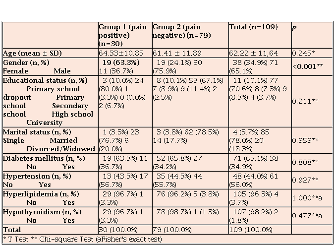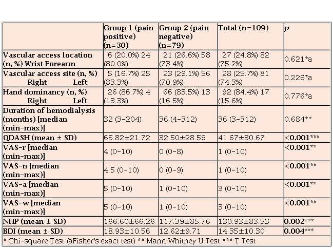 A total of 109 hemodialysis patients, including 38 women (34.9%) and 71 men (65.1%), were enrolled in the study. The mean age of the patients was 62.22 ± 11.64. The patients were grouped based on the presence of elbow pain into Group 1 (elbow pain positive, n=30) and Group 2 (elbow pain negative, n=79<). The number of women in Group 1 (63.3%) was found to be statistically significantly higher than in Group 2 (24.1%) (p<0.001). However, there were no statistically significant differences between the two groups in terms of age, education level, marital status, diabetes mellitus, hypertension, hyperlipidemia, and hypothyroidism (p>0.05). Comparisons of the demographic and some clinical features of the hemodialysis patients by the group are presented in Table 1. The mean values of Q-DASH, NHP, and BDI and the median values of VAS-r, VAS-n, VAS-a, and VAS-w were found to be higher in Group 1 than in Group 2, and the differences were statistically significant (p<0.05). There were no statistically significant differences between the two groups in terms of vascular access location, vascular access site, hand dominance, and duration of hemodialysis (p>0.05). A comparison of the demographic and some clinical features among the groups is shown in Table 2.