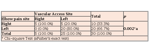 When the vascular access site and elbow pain site were compared, there was a statistically significant difference between the groups (p=0.002). The pain was on the left side in the majority of patients with elbow pain, also the vascular access site of the patients with right elbow pain was on the right side. Cross-classification tables between the vascular access site and elbow pain site are shown in Table 3.