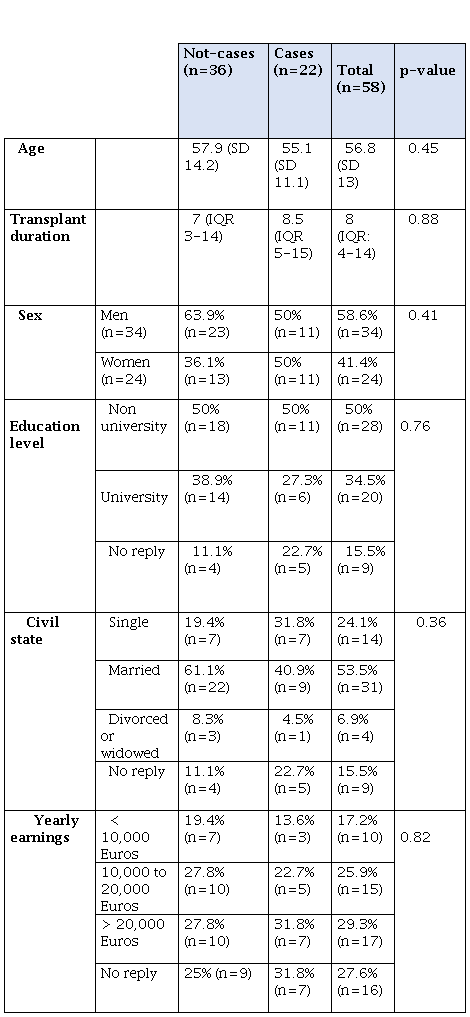 The study participants were 601 kidney transplant recipients with a mean age of 61.7 years (SD 12.8) of whom 61.9% (n= 372) were men. The median transplant duration was 10 years (IQR: 5-15). From the start of the pandemic until the end of the second wave, 12.1% (n=73) suffered SARS-CoV-2 infection and 6.2% (n=37) deaths were recorded: 3 of unknown cause, and 52.9% (n=18) of the remaining individuals (n=34) died of coronavirus infection. These figures translate to a mortality rate of 2.9% and a case fatality rate of 24.7%. Looking at the mortality data from the first wave, it was found that 13 of 36 infected persons died, translating to a mortality of 6% and case fatality of 36.1%, in contrast during the second infection wave, 6.2% (n=37) of the study population were infected with SARS-CoV-2 and 5 people died, all as the consequence of coronavirus infection, determining mortality of 0.8%, and case fatality of 13.5%. Significant differences were detected in death and lethality rates (p< 0.000) between those who had had the infection and not during the second wave. To conduct the structured interview, we tried to contact all those infected by SARS-CoV-2 during the second wave in our study population (n=28). Among these individuals, we were able to interview 22, such that the response rate was 78.6%. The mean age of these subjects (n=22) was 55.1 years (SD 11.1) and 50% (n=11) were men. For the not-cases cohort, 36 individuals (n=36) of those who had never tested positive for SARS-CoV-2, were selected for interview by consecutive sampling at the nursing facility of the Kidney Transplant Outpatients Clinic. The mean age of this cohort was 57.9 years (SD 14.2); 63.9% (n=23) were men. After carrying out the interview, the individuals were given the questionnaire, which they completed themselves in a room made available for this purpose. Both the interview and the questionnaire were carried out in the framework of a visit to the Kidney Transplant Outpatients Clinic. The sociodemographic characteristics of the subjects interviewed are provided in Table 1.