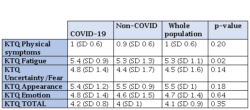 No significant differences were found in sex, age, kidney transplant duration, civil state, yearly income or education level between those with and without coronavirus (p >0.05). 58 individuals completed the KTQ, but one was eliminated because the replies given were similar for all questions. QoL was 4.1 (SD 0.9) for the whole population, ≥4 in 51.4% of the cases and 54.5% in the not-cases, with no significant difference between them (p= 0.87). The results are provided in Table 2.