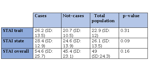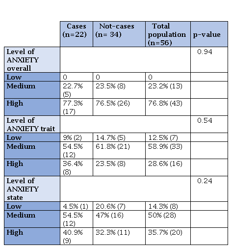 In 63.6% of cases, anxiety-state scores were greater than 40, versus 82.4% in the not-cases group. Scores for anxiety traits higher than 40 were recorded in 63.6% compared to 79.4% of the cases versus not-cases, respectively. These differences were nevertheless not significant (Table 3). According to the literature (23), the levels of anxiety of our study sample may be categorized as detailed in Table 4.