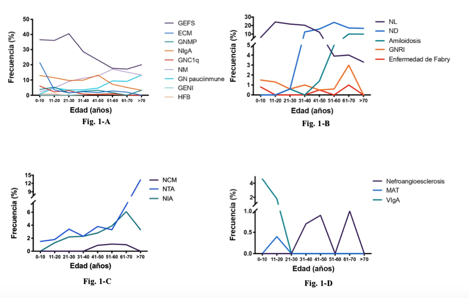 En nuestro estudio, la edad influyó en síndromes clínicos, categorías de GP y entidades específicas, similar a varios estudios estadounidenses (11,13,19). Encontramos una mayor frecuencia de NoS con patrón bimodal, con mayor prevalencia en <10 y >60 años, relacionada con GP específicas (ECM, NM, GEFS) contrariamente a la proteinuria aislada, que mostró el comportamiento contrario. El NiS fue la segunda indicación más frecuente de BR en <20 años, con disminución paulatina de frecuencia a medida que aumentaba la edad, destacando esta disminución en los >50 años. Además, en la LRA se observó un aumento gradual con la edad. En un estudio español, Rivera y colaboradores (2004) reportaron NoS como la indicación más frecuente de BR y AUA como la segunda indicación más frecuente para BR (24), lo que fue opuesto a nuestro estudio donde AUA representó una de las indicaciones menos frecuentes para BR. Ademas, Observamos mayor frecuencia de GP primarias que disminuyeron gradualmente a medida que aumentaba la edad, además de NM y GMN pauciinmune. Este comportamiento fue contrario a GP secundarias que aumentaron conforme aumentaba la edad. En cuanto a GP secundarias, encontramos a NL como uno de las GP secundarias más frecuentes, con pico máximo entre los 20-40 años, similar al reportado por otros autores (3,9,12). ND mostró un aumento en la población >20 años. Amiloidosis comienza a detectarse en poblaciones >30 años, con mayor frecuencia en >50 años. En cuanto a las enfermedades tubulo-intersticiales, la NTA mostró menor frecuencia entre 40-60 años, frente a la NCM y la NIA, que mostraron un pico máximo a los 50 años con una disminución paulatina a medida que aumentaba la edad. Las vasculopatías detectadas en este estudio mostraron mayor frecuencia de VIgA en <10 años, que disminuyó hasta desaparecer en población >30 años; a partir de ahí, aumentó la frecuencia de nefroangioesclerosis. Resultados similares de Zhou y colaboradores (2018) informaron que NIgA es la entidad primaria biopsiada con mayor frecuencia, seguida de GEFS y NM; observándose un comportamiento directamente relacionado con la edad en NIgA y NM, a diferencia de la GEFS que, como en nuestro estudio, disminuye en frecuencia al aumentar la edad a partir de los 20 años (12).