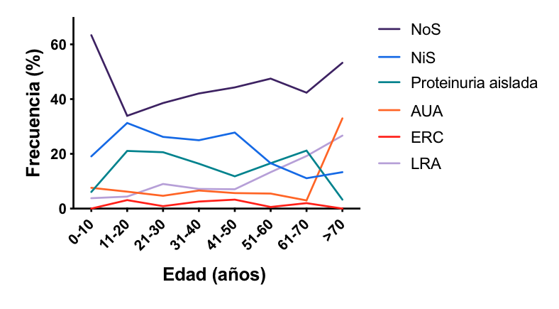 NiS, síndrome nefrítico; NoS, síndrome nefrótico; AUA:Anormalidades urinarias asintomaticas, LRA:Lesion renal aguda, ERC:Enfermedad renal cronica, GEFS: Glomeruloesclerosis focal y segmentaria; ECM: enfermedad de cambios minimos; GNMP: Glomerulonfritis membranoproliferativa; NigA: Nefropatia por Ignmunoglobulina A; GNC1q: Glomerulonefritis por C1q; NM: nefropatia membranosa; GN: glomerulonefritis; HFB: hematuria familiar benigna; GENI: glomeruloesclerosis nodular idiopatica; GNRI: glomerulonefritis relacionada a infección; GNVIH: glomerulonefritis asociada a VIH; NTA: necrosis tubular aguda; NIA: nefritis intersticial aguda; NCM: nefropatia por cilindros de mieloma; VigA: Vasculitis por inmunoglobulina A; MAT: microangioipatia trombotica.