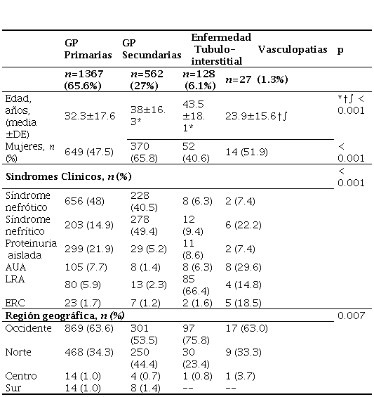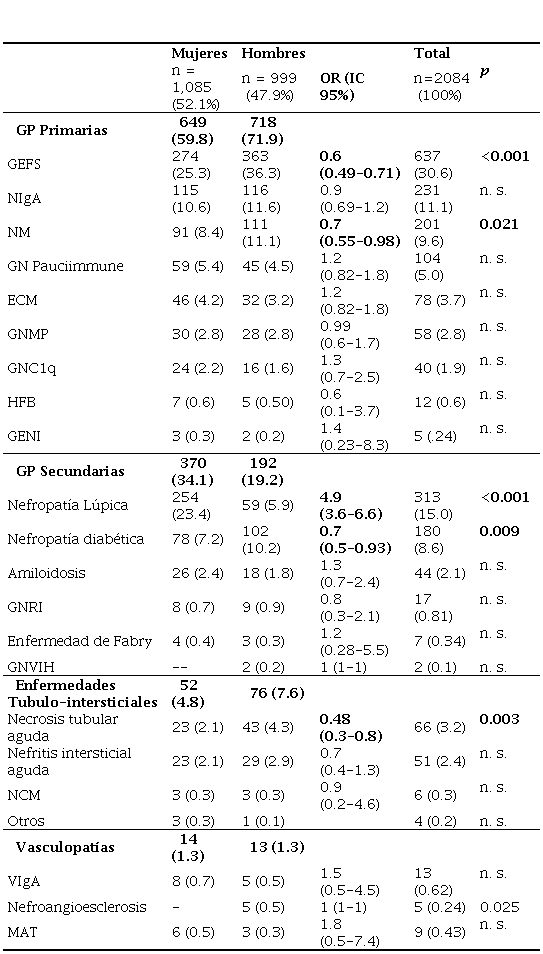 GP primarias fueron el diagnóstico histológico más frecuente, representando 1366 (65.5%), y GP secundarias se encontraron en 563 (27%); mientras que causas túbulo-intersticiales y vasculares se encontraron en 128 (6.1%) y 27 (1.3%) BR, respectivamente. La frecuencia de distribución difirió entre regiones geográficas (p=0.007). Con relación al genero, GP primarias y enfermedades túbulo-intersticiales fueron más frecuentes en hombres (717, 52.5% y 76, 59.4%, respectivamente; p<0.05), mientras que las GP secundarias fueron más frecuentes en mujeres (370, 65.7%; p< 0.001). En causas vasculares, no hubo diferencias entre géneros (tabla 1).