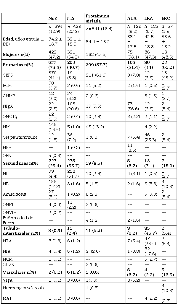 La edad promedio fue de 34.4±17.6 años: 131 BR correspondieron a niños <10 años y 129 BR a adultos >60 años. 1085 (52.1%) correspondían a mujeres. En ambos generos el síndrome clínico mas frecuente fue NoS en 894 (42.9%). En mujeres, NiS fue el segundo diagnóstico clínico más frecuente en 321 (29.6%). En hombres, el segundo diagnóstico más frecuente fue proteinuria aislada en 179 (17.9%) (Tabla 1).