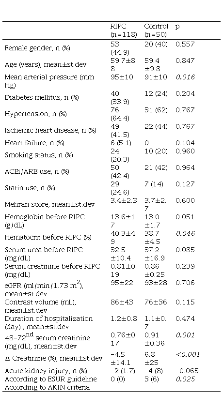 RIPC was performed in 118 of 168 patients and 50 patients served as controls. Data of the patients before and after the procedure are given in Table 1. Using the ESUR criteria, AKI incidence was found in 1.7% of 118 patients who underwent RIPC, while 8% of patients in the control group (OR: 5.053; 95% CI: 0.893-28.488; p=0.065). According to the AKIN criteria, none of the 118 patients who underwent RIPC had CIN whereas, in the control group, AKI developed in 6% of patients. (OR: 3.511; 95% CI: 2.757-4.471; p=0.025). Also, serum creatinine levels at the 48-72th hours after coronary angiography were significantly higher in controls than in RIPC patients (p=0.001). Creatinine levels were increased by 32% and 54% of RIPC patients and controls, respectively (p=0.008). No complication was observed during RIPC except pain and tingling in the extremity.