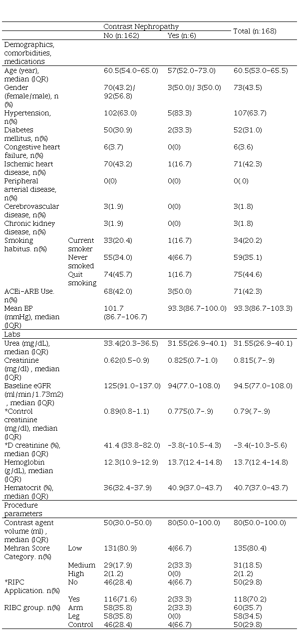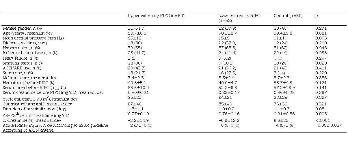 The study was completed with 168 adult patients (60 patients to upper limb RIPC, 58 patients to lower limb RIPC, and 50 patients to control group) with a mean age of 59.6 ± 9.1 years; 15 of 183 patients were excluded from the study because it could not be obtained a control blood sample; 95 (56.5%) patients were male. The median Mehran risk score was 4 (IQR 1-5) and the mean was 3.5±2.5. According to the Mehran risk score, 135 (80.4%) patients belonged to the low-risk, 31 (18.5%) to moderate-risk, and 2 (1.2%) to the high-risk category. No patient was having a very high risk for CIN. The median duration between RIPC and coronary angiography was 20 (IQR 15-30) minutes and the median dose of intravenously administered contrast medium was 80 (IQR 50-100) mL.