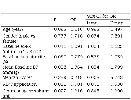 We performed a multivariate analysis to reveal independent factors related to the development of CIN using a regression model including age, gender, baseline eGFR and hematocrit, mean baseline blood pressure (BP), Mehran score category (medium or high risk vs. low risk), RIPC, and contrast agent volume and found out that baseline eGFR and mean blood pressure, contrast agent volume and, RIPC application were independently associated with the development of CIN (Table 4).The regression model included age, gender, baseline eGFR and hematocrit, mean baseline blood pressure (BP), Mehran score category (medium or high risk vs. low risk), RIPC application, and contrast agent volume that were given to the patients.