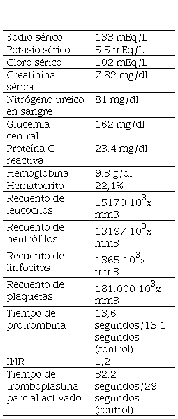 En el examen físico, con estabilidad hemodinámica (TA:130/80 mmHg FC:89 lpm FR:21 rpm SpO2:95% T: 37º) y signos de sobrecarga periférica. No se evidenciaron signos de infección local del sitio de inserción del catéter de hemodiálisis. No se auscultaron soplos cardiacos. La tabla 1describe los paraclínicos de ingreso.
