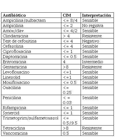 La tinción de Gram preliminar de los hemocultivos y del cultivo del lumen del catéter mostró la presencia de cocos Gram positivos en racimos, por lo que se escalonó terapia antibiótica con cubrimiento para SAMS y SAMR y se suspendió la terapia contra Gram negativos. Luego de esto, sin nuevos episodios febriles, y mejoría de los episodios eméticos. Al tercer día de tratamiento antibiótico se aisló Staphylococcus Schleiferi subespecie Schleiferi, con patrón de resistencia demostrado en la tabla 2.