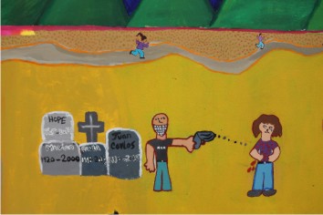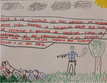Los jóvenes artistas daban testimonio visual declarando sin tapujos, con una frontalidad aterradora, las urgencias que habían confrontado y que los forzaron a escapar de terror y trauma. Por eso elegían “mandarse p’al norte” una elección que les podría traer alivio. Sabían que sería riesgoso ser indocumentados en la tierra enorme del Norte, pero ¿qué otra alternativa les quedaba? No había trabajo en El Salvador o Guatemala. Honduras se había convertido en uno de lo países más violentos del mundo. México se había vuelto un narco estado donde los carteles dominan la vida y la muerte de todos.