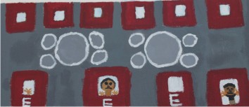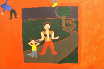 Un muchacho Salvadoreño dividió el cuadrado que definía su ventana con esmero para que las dos partes fueran exactamente simétricas. La parte derecha esta pintada en colores pardos, grises, acromáticos. Aparecen armas, una cárcel. Un cielo amenazador encierra la imagen.