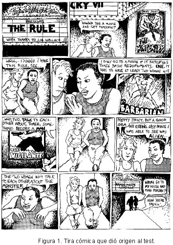 El Test de Bechdel-Wallace apareció por primera vez en la tira cómica The Rule del cómic Dikes to Watch Out For [1] de la historietista estadounidense Alison Bechdel, en 1985. En aquella tira (ver Figura 1), uno de los personajes es invitado al cine y responde que solo acepta ver una película si la misma pasa 3 condiciones: 1) debe haber al menos dos personajes femeninos en la película 2) en algún momento los personajes femeninos deben hablar entre sí, 3) acerca de algo que no sea un hombre. Estas reglas fueron ideadas por Liz Wallace, una amiga de la autora, que dijo haberse inspirado en un fragmento de A Room of One’s Own, de Virginia Woolf [2]: “And I tried to remember any case in the course of my reading where two women are represented as friends. [...] They are now and then mothers and daughters. But almost without exception they are shown in their relation to men. It was strange to think that all the great women of fiction were, until Jane Austen’s day, not only seen by the other sex, but seen only in relation to the other sex.”. Luego de la publicación, este conjunto de condiciones pasó a ser conocido como El test de Bechdel-Wallace o, como nos referiremos de ahora en adelante, Test de Bechdel.
