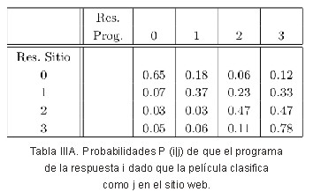 Validación del programa. Utilizando el programa desarrollado aplicamos el Test de Bechdel al corpus menor de guiones, encontrando que un 45.61 % no pasa el test. Estos datos son similares a los arrojados por el sitio web, según el cual lo falla el 46.7% de las películas. Por lo tanto creemos que la herramienta desarrollada es robusta, si bien hay algunos parámetros que podrían mejorarse. Por otro lado estos resultados confirman el sesgo existente entre ambos géneros. Para entender a qué pueden deberse las diferencias existentes entre los resultados de ambas herramientas, desagregamos los mismos en función de la cantidad de condiciones que cumplen las películas (0, 1, 2 ó 3). La Tabla III A muestra las probabilidades de dar la respuesta i dado que la película clasifica como j según el test del sitio web. Si los resultados de nuestro programa coincidieran exactamente con los de la página web la tabla debería tener 1 en la diagonal y 0 fuera. Si bien no coinciden exactamente, se ve que los elementos de la diagonal son mayores a los elementos fuera de la diagonal. Las mayores diferencias parecen deberse a que nuestro programa asigna un “3” (es decir, considera que se han cumplido las 3 condiciones) en muchos casos en los que el sitio asigna un 1 ó un 2. Esto podría deberse a que nuestro programa identifica conversaciones entre mujeres que no lo son (por ejemplo, debido a cambios de escenas) y/o no es capaz de identificar algunas referencias masculinas.