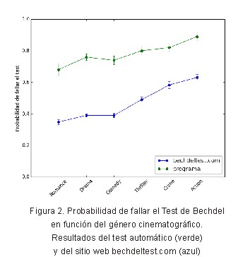 Análisis por género de película. Como una prueba de concepto de una posible aplicación del test automático se estudió la proporción de películas que fallan el test en función de los distintos géneros cinematográficos. Este análisis fue realizado sobre el corpus mayor, para lo cual se asignó cada película a uno o varios géneros. Esta información estaba disponible en el mismo sitio de donde los guiones fueron obtenidos [11]. Los géneros para los cuales se tenían menos de 100 películas fueron descartados del análisis. Los resultados obtenidos fueron luego comparados con un análisis independiente sobre la base de datos de bechdeltest.com, realizado con anterioridad [12].