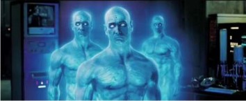 Manhattan, un superhéroe sin máscara y sin antifaz, es un ser dotado de extrema inteligencia y que cuenta con poderes excepcionales, como los de transformar la materia y percibir el tiempo como un conjunto. El ser azulado de los Watchmen cuenta con capacidad para ver un sinnúmero de mundos y contemplar la pequeñez del ser humano en medio de la grandeza del Universo. En el cómic, el pueblo lo compara inicialmente con un “superhombre”, motivo de orgullo estadounidense; es “americano” (cap. IV, p. 13).