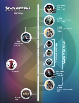 También debemos tener en cuenta que los cómics de X-Men se han adaptado a modo de sagas cinematográficas[11] en tres grupos (figura 2). El primero está conformado por las tres primeras películas de X-Men presentadas al público entre el 2000 y el 2006, donde se puede apreciar una continuidad en los personajes y en las historias. Las siguientes sagas no tienen una continuidad temporal ni de personajes. En ocasiones se muestran personajes con el mismo nombre en películas diferentes, con rasgos distintos, edades que no corresponden a una sola línea temporal[12] y, por supuesto, esto cambia un poco las historias. Teniendo este referente, la segunda saga tiene como protagonista a Wolverine, quien por la aceptación que parte del público le tiene, probablemente, decidieron darle más fuerza como personaje principal. Esta saga ha sido presentada entre el 2009 y el 2017.