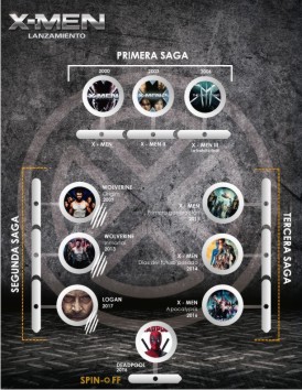 Sagas de X-Men. Se detalla el nombre de cada película, su año de estreno y cuál de las sagas pertenece. Fuente: Elaboración propia con datos de la ficha técnica de cada película.