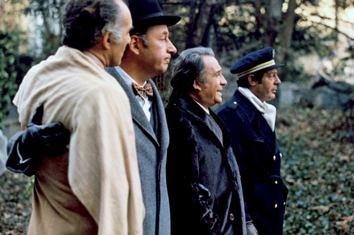Desde que comenzamos esta contribución no hemos pretendido sino introducir a La grande bouffe, film absolutamente serio, incluso en lo humorístico, histriónico y grotesco, obsceno y soez, ofensivo, transgresor e hipercrítico. El argumento es bien conocido, y no quisiéramos entretenernos demasiado con detalles: cuatro amigos se reúnen para comer. Nada de extraño, en principio. Se trata (por orden de aparición) de Ugo (Ugo Tognazzi), Michel (Michel Piccoli), Marcello (Marcello Mastroiani) y Philippe (Philippe Noiret). Un reparto estelar para una película que fuerza a los actores, tan reconocidos, a unas actuaciones muy arriesgadas [4]. El film los presenta al comienzo en sus vidas cotidianas: Ugo está casado y es chef en un restaurante, Michel está divorciado y se dedica al mundo de la televisión, Marcello es piloto de aviación comercial y un “maníaco sexual” (como dice de sí mismo), y Philippe es magistrado y convive, al cabo de los años, con su niñera, con la que mantiene encuentros sexuales. En cierto momento, se refiere a qué dirían sus compañeros de profesión si le vieran a él, a quien tienen por “un hombre serio”.