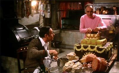 Para no morir de desgana ante la expectativa de un hartazgo acorde a la vuelta de tuerca del deseo de insaciabilidad, imprescindible para su potencial mortífero, es preciso convocar, in extremis, a la que habría de ser la última de las artes. Nos referimos, claramente, al arte culinario, es decir, al arte de cocinar. En el horizonte del sinsentido, y en las desmotivaciones que comporta, sólo podría quedar, como último acicate del deseo, el arte culinario. No es preciso avisar a un médico que pueda aliviar el malestar o el dolor, y menos aún “sanar” -porque aquí ya no se muere por enfermedad alguna-, ni siquiera se ha de llamar, en principio, a ninguna funeraria, pues los cadáveres son introducidos en un enorme frigorífico que hay en la cocina. No hay que llamar a Nadie. Sólo es necesario el Cocinero, pero un magnífico cocinero, capaz de seguir motivando, con sus maravillas culinarias, el deseo de comer-sin-ganas. Y a buen seguro que Ugo se esmera en ello, a veces sin el éxito deseado, especialmente al final del film, que culmina con un solitario atracón de patés por parte de Ugo, habiendo comenzado la comilona -ya fue dicho- con un atracón “comunitario” de ostras.
