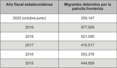La migración de indocumentados de México a Estados Unidos se ha incrementado de manera considerable en los últimos años, pese al reforzamiento de las medidas de seguridad fronteriza y al mismo clima antimigratorio que se ha promovido en varios de los estados americanos colindantes con el territorio mexicano. Entre 2005 y 2012, el promedio de migrantes de origen mexicano que intentaban cruzar la frontera era de 570,000 personas al año, aproximadamente (Orraca Romano y Corona Villavicencio, 2014, p. 13). Los años siguientes, las cifras continuaron aumentando sin poder identificar una tendencia a la baja. Incluso, en la primera mitad del año 2020, pese a la crisis sanitaria derivada de la epidemia del Covid-19, el flujo migratorio continuó sin grandes variaciones respecto a los mismos meses en años previos. En la siguiente tabla se presenta el panorama estadístico de los últimos años tomando como referencia el número de migrantes que han sido detenidos por la patrulla fronteriza estadounidense. Cabe recalcar que resulta imposible tener un control numérico de los migrantes indocumentados que logran cruzar exitosamente la frontera, así como de quienes no lo consiguen o mueren durante el proceso. Aunque las cifras a continuación incluyen detenciones de personas que no son de origen mexicano, nos presentan un panorama base para reflexionar sobre la situación: