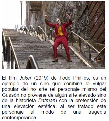 Por grande que sea, por imbricado que esté en nuestra época, ese arte de la aglomeración general se arraiga para siempre en el gusto de todas las clases, de todas las edades y de todas las naciones, para mostrar el espectáculo del poderoso al que un vagabundo rocía con agua de estiércol; el de un enorme navío que se hunde; el de un monstruo espantoso surgido de las entrañas de la tierra; el del Bueno que, a pleno sol, tras innumerables sinsabores, mata por fin al Malo; el del policía detective que atrapa al ladrón mafioso; el de las costumbres extrañas de los extranjeros y de los caballos en la llanura; el de los guerreros fraternos; el del drama sentimental y el de la mujer desnuda descuartizada por el Amor. Los más grandes artistas de este arte, Chaplin o Friedrich-Wilhelm Murnau, no hicieron más que poner de relieve esta procedencia vulgar, sin tratar jamás –muy al contrario- de abolirla. (Badiou, 2004, p.281)