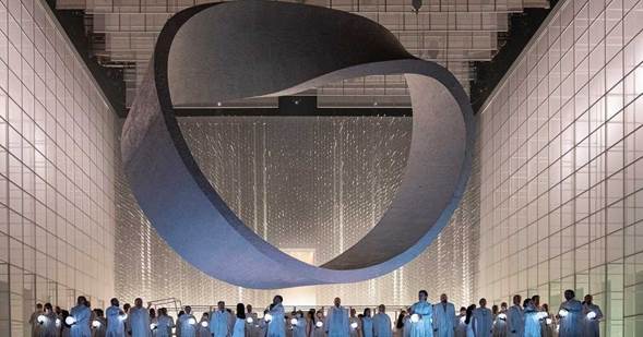 Curiosamente, es también la banda de Moebius, la que domina la escenografía de una reciente puesta de la ópera Nabuco en el teatro Colón de Buenos Aires. La memoria del pueblo hebreo es evocada por esta potente figura que se cierne sobre el coro multitudinario del “Va pensiero” de Giuseppe Verdi.