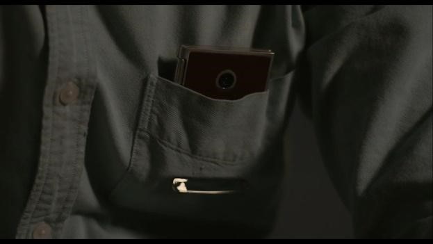 Efectivamente, como señala Theodore en una discusión posterior a dicho fracaso, el problema de esta nueva fantasía remite a la naturaleza objetal de su relación, que le satisface como tal y que no parece haber sido codificada por Samantha del mismo modo, quien, en ese punto, ha aprendido y repite actitudes humanas como manifestación afectiva. No obstante, es esta “humanidad”, específicamente expresada mediante un suspiro, lo que incomoda a Theodore. Así, mientras que Samantha agrega ese signo oral a su discurso porque “that’s how people talk. That’s how people communicate” (Jonze, 2013b, p.79), Theodore comenta: “That just seems odd. You just did it again (exhale)…/ I mean, it’s not like you need any oxygen or anything…/ You’re not a person” (Jonze, 2013b, p.79). En este punto, es interesante notar cómo el uso de planos subjetivos durante la escena aludida reafirma la identificación entre el espectador y Theodore, sobre el cual se focaliza, por ejemplo, cuando este mira hacia el piso o hacia una calle, dado que, así, se precisa que la perspectiva de Samantha, por lo menos hasta ese momento, parece limitarse a “ver” el mundo que Theodore le permite conocer. Esto se sabe, en la medida que, a lo largo de la película, la habitabilidad exterior de Samantha se ha asociado al dispositivo móvil desde donde se proyecta su voz y que, como se ve, depende de un imperdible, aquello que, pese a su precariedad técnica, supedita la inteligencia y utilidad de Samantha a la existencia objetal que se le otorga (véase Figura 11). En este sentido, el uso de este elemento rudimentario refuerza la unión entre objetos, no una intersubjetividad entre dos sujetos deseantes.