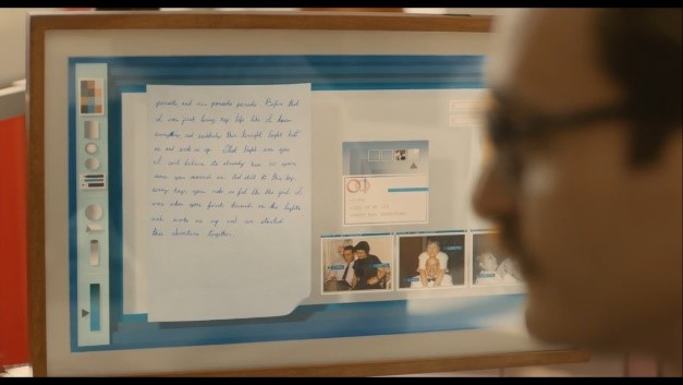 En otras palabras, el Eros cansado, narcisista y depresivo subraya la imposibilidad de los sujetos de amar más que una proyección atomizada de sí mismos y, por tanto, tan solo una apariencia. Bajo estas consideraciones, tal como lo presenta inicialmente Her, Theodore va a llevar a cabo una sexualidad que podría calificarse como pornográfica, en tanto se identifica tanto menos como una modalidad obscena que como una parodia que no invierte ni arriesga un afecto mayor que el placer narcisista (Agamben, 2005, p.59). Un primer ejemplo de ello se exhibe en la escena inicial de la película, cuando, bajo un primer plano del protagonista masculino, el espectador da cuenta de un simulacro: Theodore, dedicado laboralmente a dictar cartas a una computadora, aparenta amar. La transparente y legitimada capitalización de los afectos en la sociedad de Her se presenta, entonces, como una teatralización. Theodore trabaja creando afectos para otros e, indirectamente, para sí mismo, en la medida que dicha mímesis afectiva repercute en su estancamiento melancólico al actualizar, reiteradamente con cada nuevo simulacro, una suerte de esencialidad amorosa reproducible y añorada. Como se observa en la misma escena, durante el dictado de las cartas, el protagonista sonríe; es decir, aprehende corporalmente la experiencia amorosa que imita al escribir un discurso que no le pertenece, pero que, en su repetición, hace suyo (véase Figura 1). En esta instancia, la conexión entre la intimidad de los afectos y el cuerpo erotizado, en tanto amado o amante, no solo simula un contacto físico, si se atiende, por ejemplo, a cómo Theodore remeda digitalmente una escritura a mano que finalmente resulta impresa, sino también es puesta en duda en Her, asociada ya a una mecanización económica y afectiva, donde las relaciones objetales parecen reemplazar a la interacción humana (véase Figura 2).