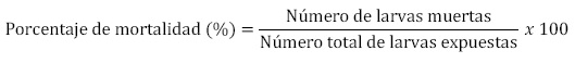 Las larvas de Aedes aegypti cepa Rockefeller se colectaron en la zona residencial del municipio de Barranquilla (Atlántico), a partir de reservas de agua potable, las cuales se trasladaron al Laboratorio de Salud Pública del Atlántico, donde se realizó su identificación y se obtuvieron huevos de la siguiente generación del vector. Posteriormente, se trasladaron al laboratorio para la formación del estado larvario de Aedes aegypti sumergidos en agua para inducir la eclosión, las larvas que emergieron se transfirieron a agua limpia para la alimentación de las mismas, se criaron hasta el III estadio 15, se seleccionaron las larvas necesarias para efectuar el ensayo biológico, bajo condiciones adecuadas de 29 ± 1°C y humedad relativa (72 ± 4%).