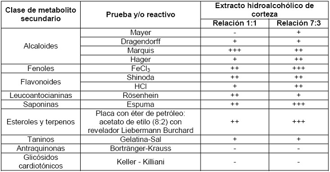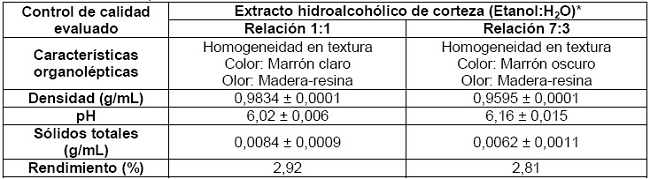 Para los controles de calidad se evaluó las características organolépticas (olor y color), densidad, pH, sólidos totales y rendimiento, según las metodologías descritas por Ochoa (2013) 13. Mientras, para determinar la presencia de los grupos químicos mayoritarios de los extractos hidroaocohólicos de la corteza de Pala scholaris, se utilizó diversas pruebas y reactivos específicos para identificar la presencia de flavonoides, alcaloides, taninos, antraquinonas, fenoles, glicósidos cardiotónicos, saponinas, leucoantocianinas, esteroles y terpenos 14.