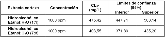 El extracto hidroalcohólico de corteza P. Scholaris a una concentración de 1000 ppm, con una proporción 1:1 obtuvo una CL50 (mg/L) de 475,42 y el extracto de corteza P. Scholaris a una concentración de 1000 ppm, con una proporción 7:3 una CL50 (mg/L) de 403,55, en la literatura se ha reportado que la actividad larvicida se debe principalmente a la presencia de monoterpenos, los cuales han demostrado actividad larvicida en diferentes especies de mosquitos; esto coincide con la presencia de estos constituyentes en los extractos evaluados, se ha descrito que la acción de los compuestos larvicidas se debe principalmente a la absorción por al tracto respiratorio o la ingestión de estos compuestos que al entrar en contacto con la larva causan un efecto generalizado, ocasionando la muerte27, este efecto depende de la concentración y el tiempo de exposición, como se observó en los resultados obtenidos.