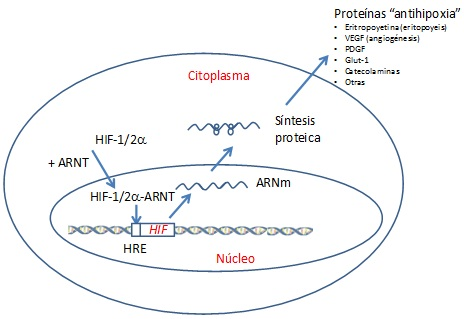 La proteína codificada contiene un dominio de proteína hélice-bucle-hélice básica, así como otro dominio identificado en las proteínas involucradas en rutas de transducción de señales que responden a los niveles de oxígeno del ambiente5,8,9,10. El gen HIF (componente 2() está implicado en el desarrollo del corazón embrionario y se expresa en las células endoteliales de las paredes de los vasos sanguíneos del cordón umbilical para mantener el control homeostático de las catecolaminas y con ello prevenir el riesgo de insuficiencia cardíaca9. El dímero HIF, además de inducir la expresión génica de la eritropoyetina, induce a otros genes que son muy necesarios para una respuesta correcta celular y sistémica frente a la hipoxia y el mantenimiento de la homeostasis celular (Figura 1). Entre ellos estaba el gen del factor de crecimiento endotelial vascular (en inglés VEGF, de vascular endotelial growth factor gene), que desempeña papeles importantes en la angiogénesis11.