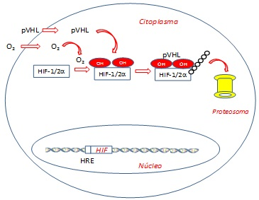 El proceso delimitado en la Figura 2 sugirió que la regulación de HIF es postranscripcional: HIF-1α se transcribe, traduce y degrada rápidamente, a menos que el oxígeno se vuelva limitante. Así, se identificó una segunda proteína homóloga, HIF-2α, que presenta una regulación dependiente de hidroxilación idéntica a través de pVHL. Cuando se estabiliza el HIF-1/2α, se heterodimeriza rápidamente con HIF-1β (no presentado en los esquemas), transcribiendo cientos de genes que son críticos para la respuesta celular a la hipoxia entre los que se incluyen el VEGF, el gen del factor de crecimiento derivado de plaquetas B (PGFB), gen de la eritropoyetina (EPO) y genes involucrados en la captación de glucosa y el metabolismo, de enorme importancia en la homeostasis y la supervivencia20,21 (Figura 1).