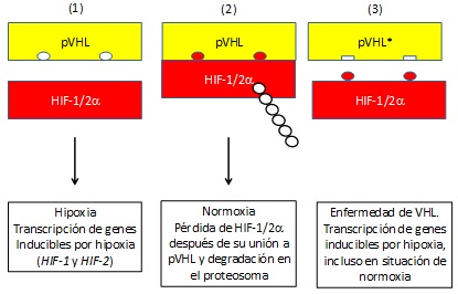 En condiciones de baja concentración de oxígeno o en casos de enfermedad de VHL, donde el gen VHL está mutado (Figura 3), la proteína pVHL no se une a HIF-1α, ya que al no ser reconocida escapa de ser degradada22,23. Como hemos comentado la pVHL presenta actividad ligasa tipo E3 que ubiquitina a HIF-1α y causa su degradación por el proteosoma (Figura 2 y Figura 3).