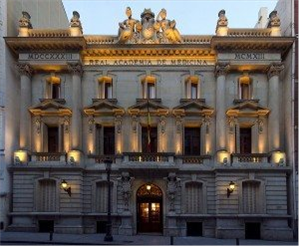 Real Academia Nacional de Medicina: Figura 2 y Figura 3. La Real Academia Nacional de Medicina de España fue fundada el 28 de abril de 1861. Su precedente fue la Real Academia Médica Matritense (1734), surgida a mediados del siglo XVIII como tertulia de médicos, cirujanos y boticarios, y que se reorganiza por Real Decreto de 28 de abril de 1861, «para fomentar el progreso de la medicina española, publicar su historia bibliográfica, formar la geografía médica del país y un diccionario tecnológico de la Medicina». El Real Decreto de 8 de agosto de 1830 que establecía reglamentos para las academias de medicina, la generalizó a las demás provincias de Castilla la Nueva, la actual Castilla-La Mancha, con el nombre de Academia de Medicina y Cirugía de Castilla la Nueva. La Academia otorga premios de varias clases mediante concursos y certámenes públicos y ha editado importantes obras como la Farmacopea oficial, la Biblioteca clásica de la Medicina española y unos interesantes Anales. Consta de cincuenta académicos numerarios, académicos de honor, varios correspondientes en Madrid, provincias y extranjero. Desde 2012 está presidida por Joaquín Poch Broto 1-3.
