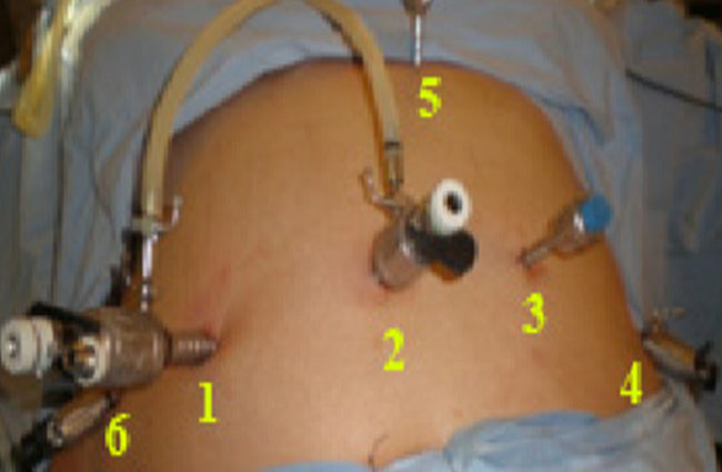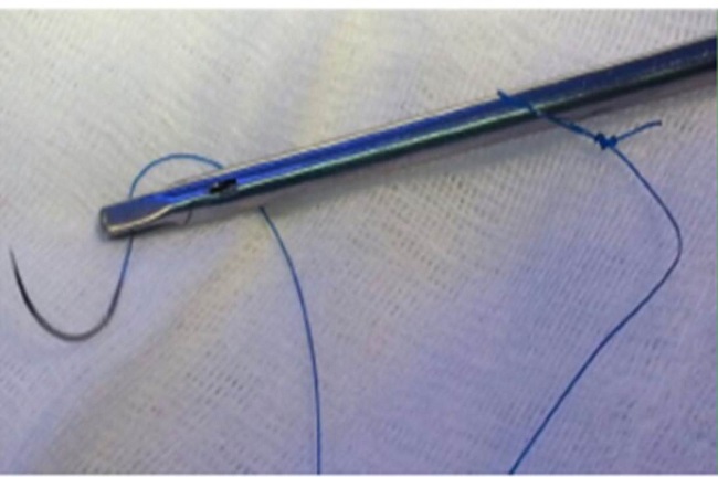 The surgeon clamps and holds the thread very close to the needle with his left hand and introduces it into the abdomen by means of a trocar of 10 (Figure 3). Once in the abdomen, with the needle holder of the right hand, he holds the needle in the center and begins the suture of both gastric walls. Simply pull the thread to complete the first knot. The procedure is quick and easy, without having to knot in the abdomen.
