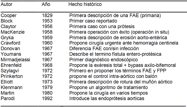 Las FAE se clasifican en primarias (aneurismas, infecciones, traumatismos, o radioterapia), y secundarias a cirugía aórtica previa. Entre las últimas, existe una variante denominada fístulas paraprotésicas o erosiones (entre el cuerpo o ramas de la prótesis con el intestino), bien diferente a una verdadera FAE (que comunica la línea de sutura prótesis-aorta con el intestino) 1. La primera descripción, lógicamente de una FAE primaria la realizo Astley Cooper (1829); el primer caso de FAE secundario, fue reportado por Block (1953). Para otros hechos históricos ver Tabla 1. 1-2