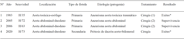 En este periodo hemos tratado 4 pacientes portadores de fistulas entre la aorta y el aparato digestivo (Tabla 2). Los tres primeros casos ya fueron publicados 9-10; el cuatro paciente es el actual.
