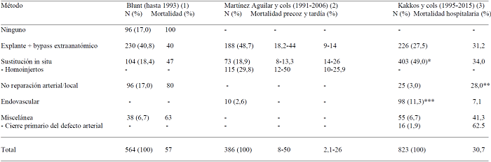La revisión de Kakkos y cols 12, al incluir un gran número de pacientes (n = 823) les permitió realizar comparaciones entre las técnicas abiertas y endovasculares en el tratamiento de las FAE. La cirugía abierta tuvo una mayor mortalidad hospitalaria (33,9%), respecto los métodos endovasculares (7,1%), pero que se reducía durante el seguimiento a largo plazo. Complementariamente un enfoque endovascular por etapas, en candidatos adecuados logró los mejores resultados; así la endoprótesis seguida de reparación in situ, con injertos venosos, mejoran los resultados a largo plazo, si bien los casos publicados superan escasamente la docena.