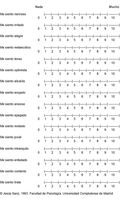 A continuación (Figura 1), encontrarás una serie de frases que describen diferentes clases de sentimientos y estados de ánimo, y al lado unas escalas de 10 puntos. Lee cada frase y rodea con un círculo el valor de 0 a 10 que indique mejor cómo te SIENTES AHORA MISMO, en este momento. No emplees demasiado tiempo en cada frase y para cada una de ellas elige una respuesta.
