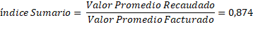 La propuesta de un Índice sumario que relaciona lo recaudado y lo facturado, según el comportamiento histórico, se realiza sobre la base de los valores promedios existentes. Sin dudas, un indicador de contribución al análisis de liquidez en la organización. La expresión de calculo y el valor obtenido se reflejan a continuación: