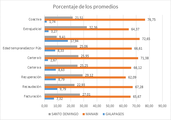 Se aprecia correspondencia entre los porcentajes de comportamiento de las distintas carteras con los valores facturados y recaudados, alrededor y superior al 62 % para Manabí que se convierte en la provincia decisiva de los resultados de la región. Sin embargo, se debe prestar atención a las carteras vencidas totales, la del sector público y la coactiva que alcanzan valores para Manabí superiores al 72 % en los tres casos que resultan resultados que atentan contra la liquidez de la región.