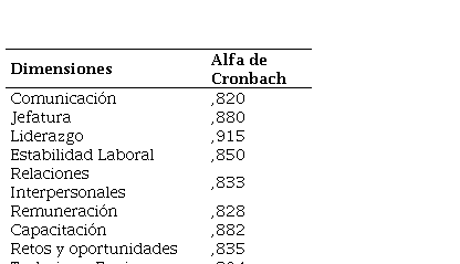 Se aplicó una encuesta referente al clima laboral, la cual fue desarrollada y validada por un equipo de trabajo de la Pontificia Universidad Católica del Ecuador Sede Ambato, la cual estuvo constituida por 51 ítems, que estaban divididos en 10 dimensiones, se trabajó con una escala de Likert con un rango de cinco opciones, que iba desde totalmente de acuerdo hasta totalmente en desacuerdo. En la tabla 1 se pueden observar las dimensiones de la herramienta y el Alfa de Cronbach.