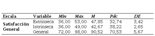La media obtenida en la satisfacción general fue de 90,52, con respecto al 70,53 que es el punto de corte, y una desviación estándar de 5,67. En las dos dimensiones que conforman la satisfacción general están la intrínseca y la extrínseca, con unas medias de 42,67 y 47,85 respectivamente, que están sobre los puntos de corte que van entre 32 y 38, con unas desviaciones pequeñas. Considerando que la puntuación de la satisfacción general oscila entre 15 y 105, mientras que la satisfacción intrínseca va de 7 y 49, y la satisfacción oscila entre 8 y 56, se concluyó que la media en los tres casos no muestra o evidencia problemas.