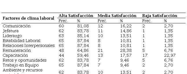 Los resultados en la encuesta de clima laboral se expresaron en unidades de frecuencia y porcentaje referentes al nivel de satisfacción existente dentro de cada factor evaluado, se dividen en alta, media y baja satisfacción. Se observó que existen factores que no presentan ningún tipo de problemas, así, por ejemplo, las relaciones interpersonales, el trabajo en equipo con un 87,84%, y el liderazgo con un 85,14 de satisfacción alta. Los factores que presentan inconvenientes son las remuneraciones que tienen un nivel de satisfacción media, y la capacitación que presentan baja satisfacción, por ende, los dos últimos podrán ser factores a revisar para mejorar el clima laboral.