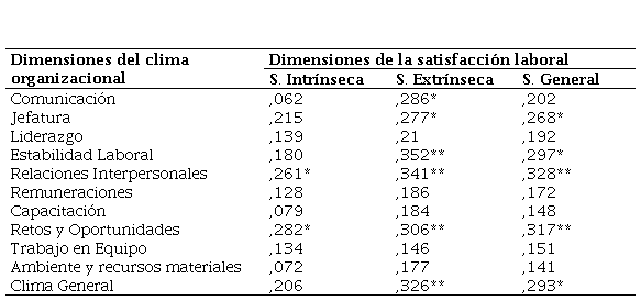 En la matriz de correlaciones de la tabla 6 se puede observar que existe relación entre algunas de las dimensiones del clima organizacional y las de la satisfacción laboral. Entre ellas destacan las relaciones positivas bajas significativas que tienen las relaciones interpersonales con todas las dimensiones de la satisfacción laboral. Esto indica que los sujetos que indican que tienen unas buenas relaciones interpersonales también puntúan alto en satisfacción y viceversa. Por otra parte, los retos y oportunidades siguen la misma línea que las relaciones interpersonales, con relaciones bajas positivas y significativas con la satisfacción laboral. Es de destacar, que la satisfacción intrínseca no se relaciona con ninguna otra dimensión del clima organizacional. En cambio, la satisfacción extrínseca también se relaciona de manera positiva y significativa con la comunicación, jefatura, estabilidad laboral y clima en general.