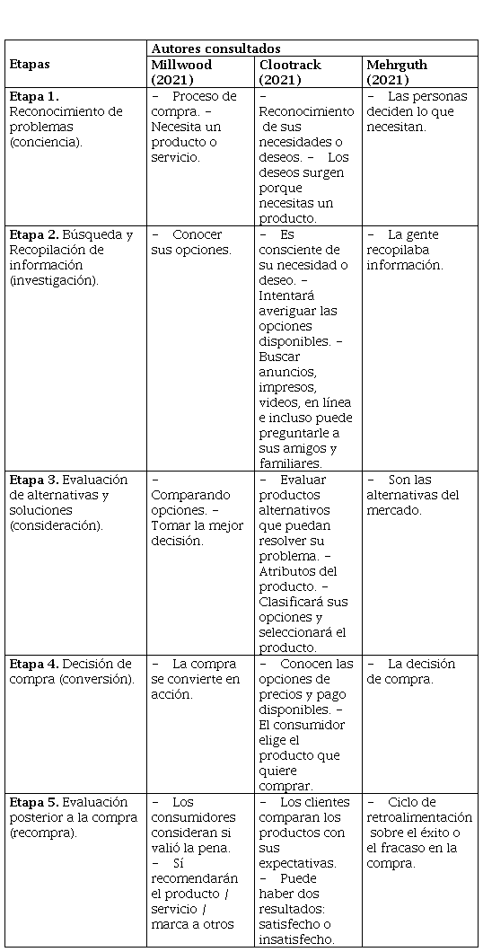 En cuanto a las etapas en el proceso de decisión del consumidor, se presentan en la tabla 1: Reconocimiento de problemas; Búsqueda y recopilación de información; Evaluación de alternativas y soluciones; Decisión de compra; y Evaluación posterior a la compra (Millwood, 2021; Clootrack, 2021; Mehrguth, 2021).
